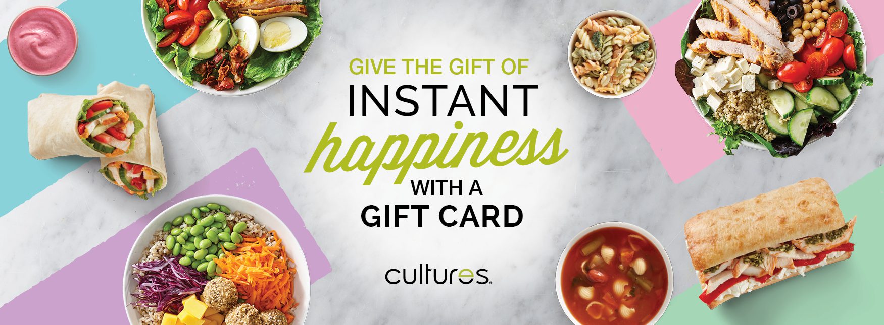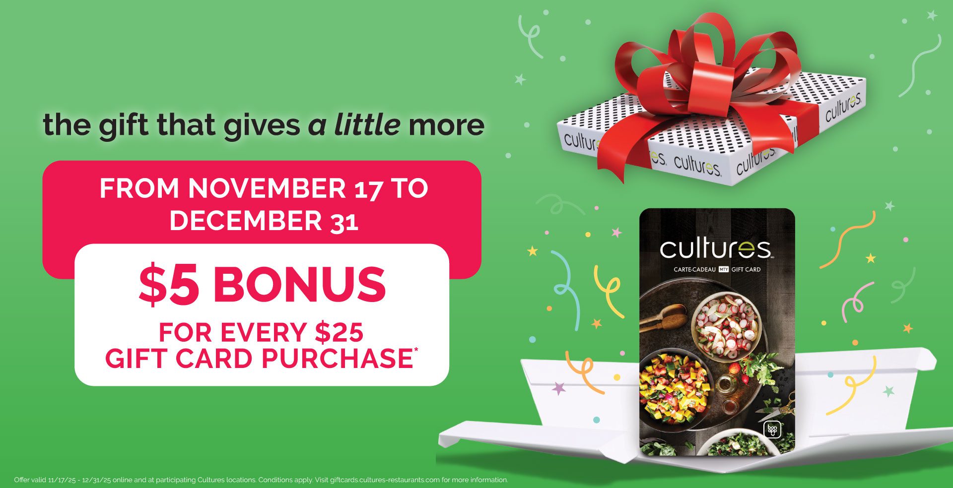 Available in-store for gift card purchases with a minimum $25 purchase per transaction from November 17-December 31, 2025. Qualifying gift card purchases include a $5 bonus on $25 gift card purchase, $10 bonus on $50 gift card purchase, and $20 bonus on $100 gift card purchase. The bonus top-up will be on the same Gift Card. Please allow up to ten (10) to fifteen (15) minutes for the bonus to be applied to the Gift Card. Bonus amount will not appear on the original purchase receipt. Bonus/Topped Up Gift Card value(s) are issued per qualifying purchase up to a maximum of $20 in bonus value. Gift Cards are redeemable only at participating Cultures locations. Gift card values, including the bonus, cannot be exchanged or redeemed for cash and are non-transferable. Lost, stolen, or damaged Gift Cards will not be replaced. Offer not valid with any other promotions or discounts. Cultures reserves the right to modify or cancel this offer at any time without prior notice.