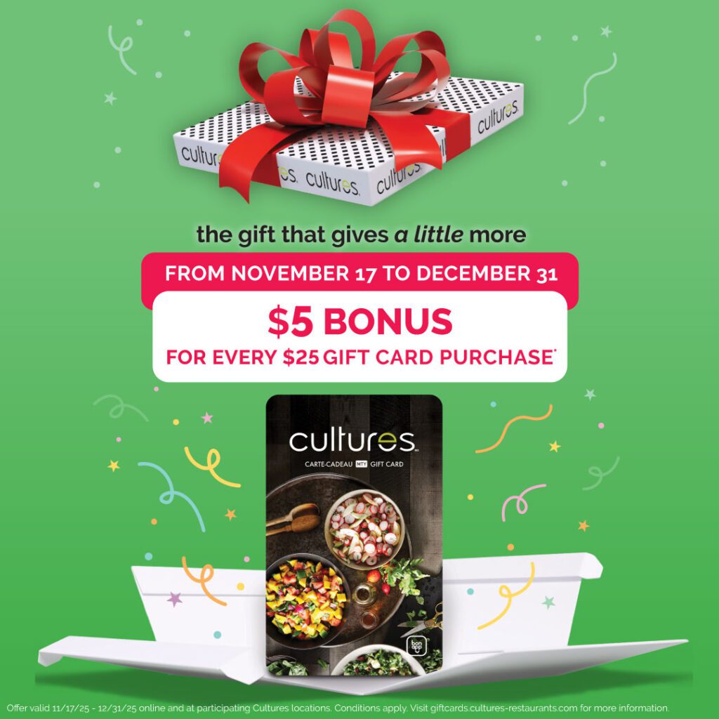 Available online for gift card purchases with a minimum $25 purchase per transaction from November 17-December 31, 2025. Qualifying gift card purchases include a $5 bonus on $25 gift card purchase, $10 bonus on $50 gift card purchase, and $20 bonus on $100 gift card purchase. The bonus top-up will be on the same Gift Card. Please allow up to ten (10) to fifteen (15) minutes for the bonus to be applied to the Gift Card. Bonus amount will not appear on the original purchase receipt. Bonus/topped up Gift Card value(s) are issued per qualifying purchase up to a maximum of $20 in bonus value. Gift Cards are redeemable only at participating Cultures locations. Gift card values, including the bonus, cannot be exchanged or redeemed for cash and are non-transferable. Lost, stolen, or damaged Gift Cards will not be replaced. Offer not valid with any other promotions or discounts. Cultures reserves the right to modify or cancel this offer at any time without prior notice.